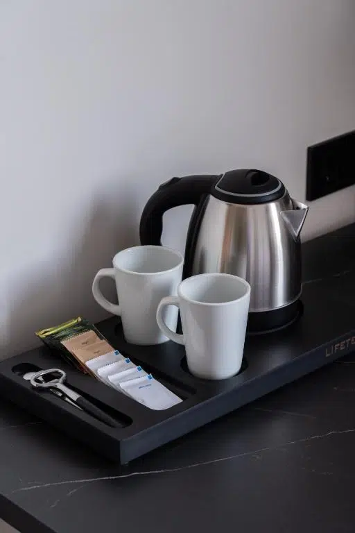 В каждом номере есть чайный набор (чай, кофе, сахар, чайник) и вода в бутылках.
